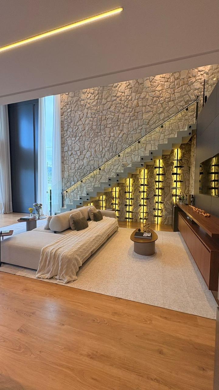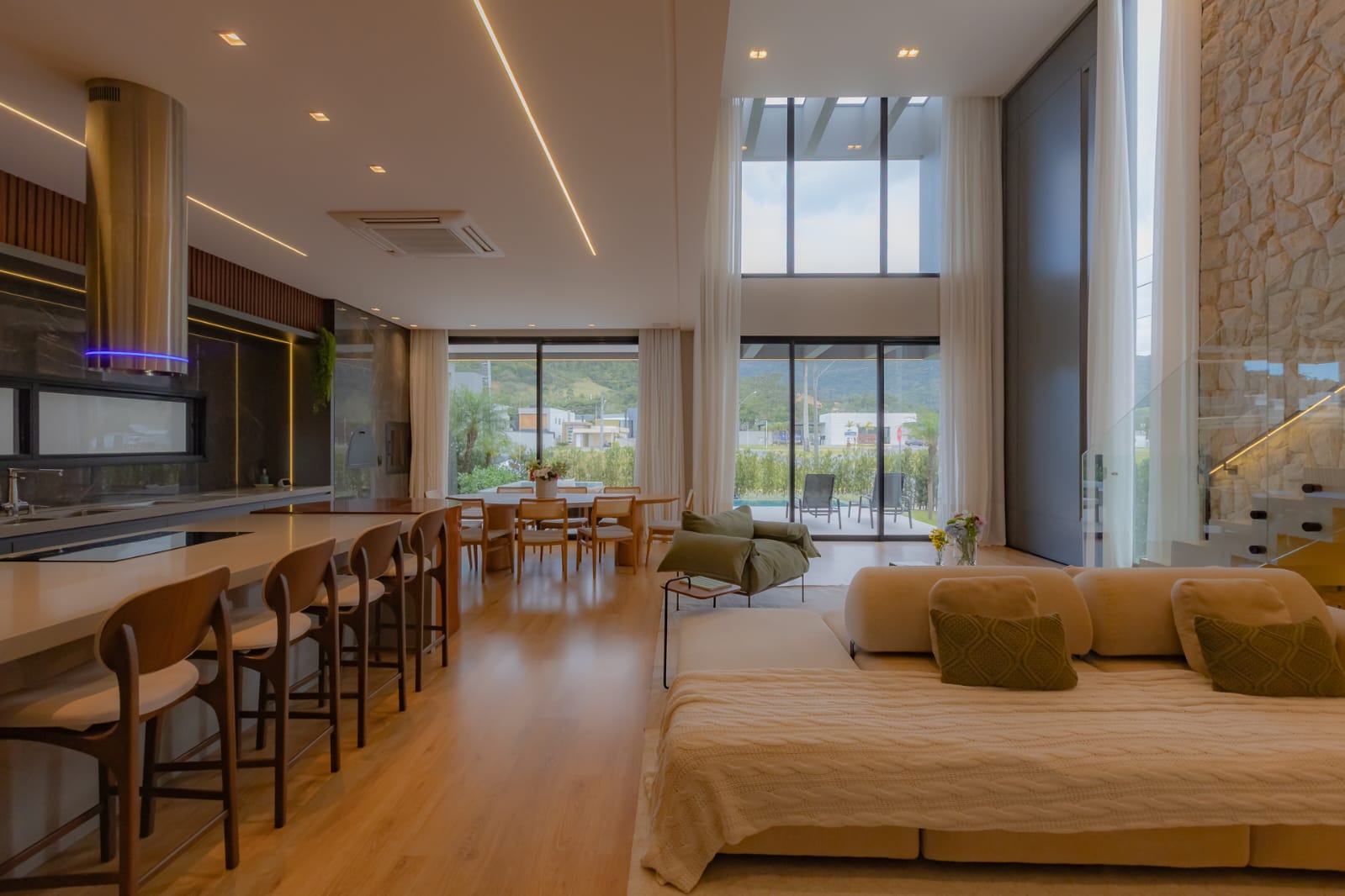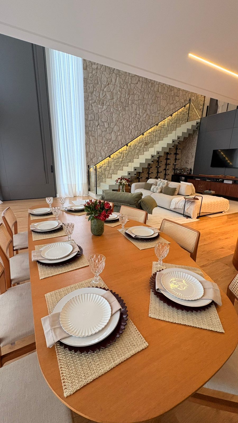 Casa belíssima no Caledônia, pronta pra morar! 100% mobiliada e equipada com altíssimo padrão! 465 m² de construção. Living amplo, integrado, pé direito duplo belíssimo. 4 suítes, sendo 1 master com banheira de imersão e closet ( 1 delas no primeiro pavimento). 1 sala de cinema com banheiro (pode vir a ser a quinta suíte). Área gourmet com churrasqueira a carvão e forno de pizza à lenha, para aproveitar bons momentos em família. Área externa com piscina. Energia solar. Carregador pra carro elétrico. Casa de esquina, ótima localização no condomínio!
